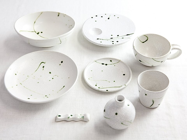 トップページ > 作品紹介 > KASENモダンシリーズ ハット鉢シリーズ 桃山陶の銅鑼鉢(どらばち)をヒントに開発されたリムのある多用途な鉢たちです。その形が帽子のようだから「ハット鉢」と命名、どのサイズも何通りかの用途が頭に浮かぶデザインは食卓のヘビーローテーション間違いなしです。 ▲このページのトップへ シノギシリーズ ロクロ成形したのちに、更に曲がりを使って削り出されるシノギ技法の器です。 軽さが自慢の霞仙のロクロ物の中でも特別に軽いのが自慢です。どの釉薬との相性も良く食卓の色合いを生かす一品が必ず見つかるはずです。 ▲このページのトップへ 菊皿シリーズ 古くから懐石の器として使われてきた菊割のデザイン。現代の生活に合うようにサイズ展開や釉薬のバリエーションを増やしてきた霞仙のロングセラーです。和にも洋にも違和感なく納まるオールマイティーな器です。 ▲このページのトップへ 茶ゴコロシリーズ 伝統の織部紋様の図柄を小皿の形に変えた小皿のシリーズ。2013年のナゴヤドームでの女子コレの器コンペで金賞を受賞しました。ちょっとしたお菓子を乗せるだけで、ティータイムが楽しくなりますね。 ▲このページのトップへ リム皿シリーズ 洋食器のデザインの特徴としてリムのある器があげられます。リム皿シリーズは伝統の素材と技法を用いながらも、洋食器を意識したシリーズとなります。お手持ちの洋食器とも違和感なく、それでいて和食も似合ってしまう万能な器になりました。 ▲このページのトップへ 白貫入織部ソースシリーズ 霞仙の伝統技法の中でも栃渋抜き(とちしぶぬき)による貫入の装飾があります。酸化焼成の柔らかい焼き上がりの白釉に織部をソースのように流し掛け。ひとつひとつ違う貫入の紋様と流し掛けの織部は、お手にとってお好みの一品を是非選んで頂きたいシリーズです。 ▲このページのトップへ 耐熱シリーズ お料理ファンの皆さまからの熱い要望にお応えして、このシリーズのみ土鍋用の耐熱の粘土を使って制作しています。土の違いによって思わぬ発色となった4種の釉薬限定でハット鉢をベースにした大小のハット鍋を作りました。 蓋が無くても素敵に見える鍋…がコンセプト。オールシーズン使える耐熱の器です。 ▲このページのトップへ